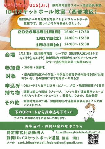 2026年1月11日 掛川南体育館 し~すぽでバスケットボール教室が開催されました。