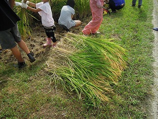今日の参加は、幼児が多く 刈った稲を一生懸命運んでくれました
