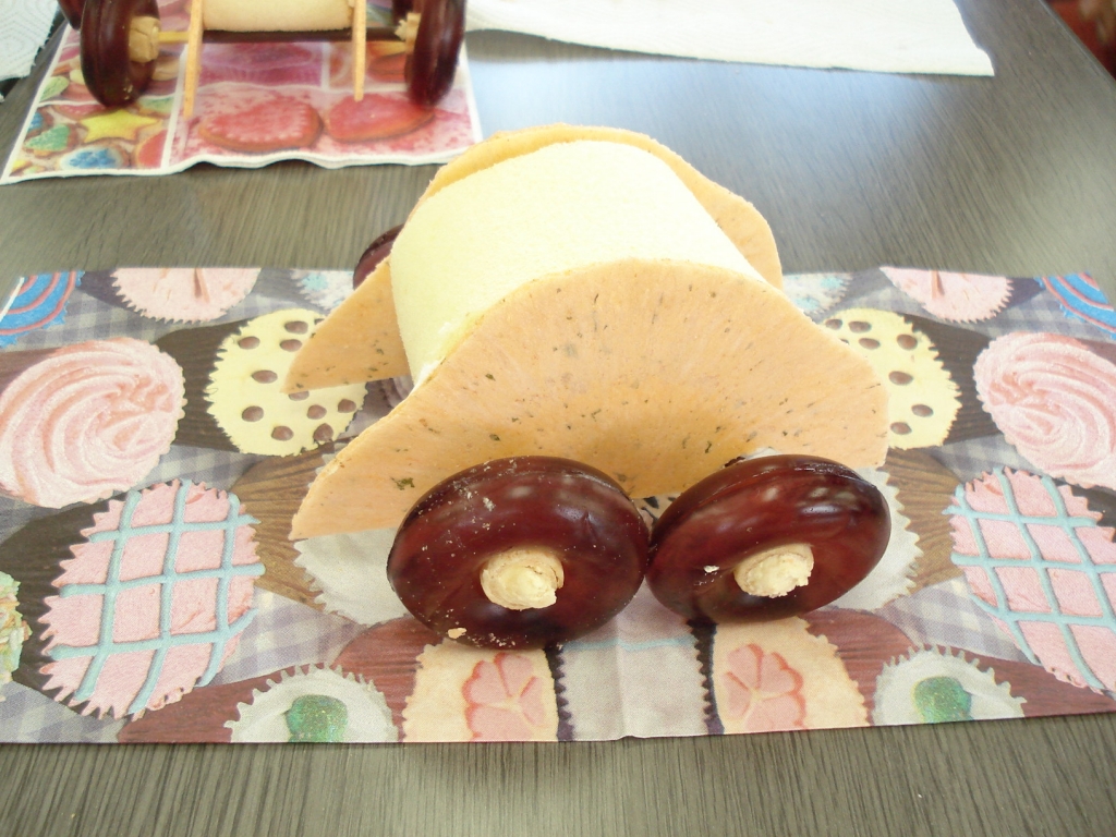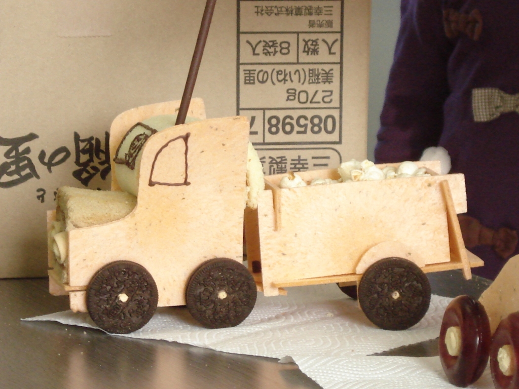 自動車です。 タイヤはゼリー・本体はロールケーキ・えびせん・主軸はポッキー。