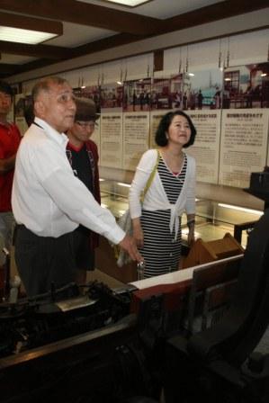 記念館館長さんが、ビデオの上映とその詳細な説明、敷地内(生家、発明に没頭した物置小屋、発明への思いを決意した見晴らし台など)の案内、織機のデモ運転など、90分間も熱い説明をしてくださいました。