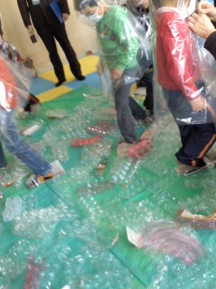 飛び散ったガラスに見立てた卵パックの上を歩きました。